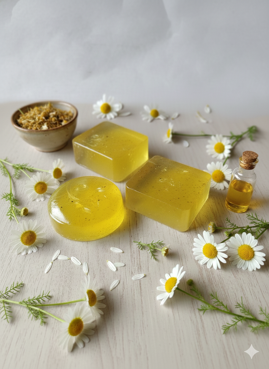 A combinação de extrato de calêndula, camomila em pó, óleo de coco, óleo de semente de uva e essência de calêndula em um sabonete artesanal resulta em um produto com potentes propriedades calmantes, hidratantes, anti-inflamatórias e cicatrizantes.
